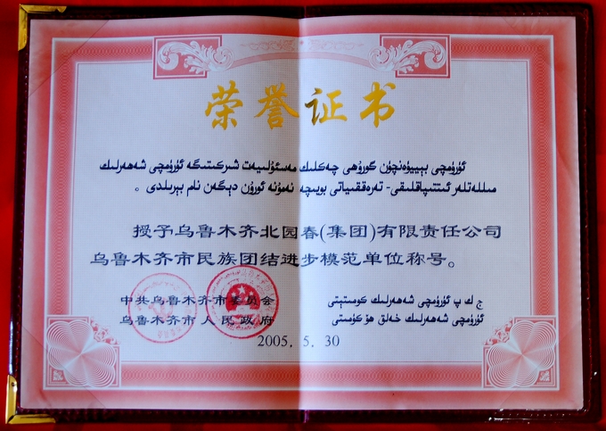 2005年5月,北園春集團公司被烏魯木齊市人民政府授予“烏魯木齊市民族團結進步模范單位”稱號。