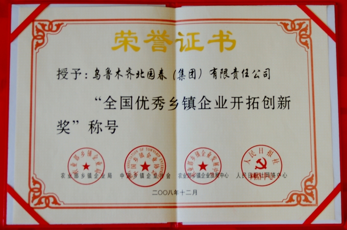 2008年12月,北園春集團公司榮獲農業部鄉鎮企業局、農業部鄉鎮企業發展中心等單位聯合頒發的“全國優秀鄉鎮企業開拓創新獎”稱號。