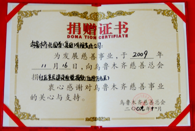 2009年11月,北園春集團公司向烏魯木齊慈善總會捐款50萬元作為社區基層建設維穩專項資金。