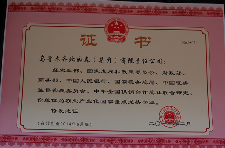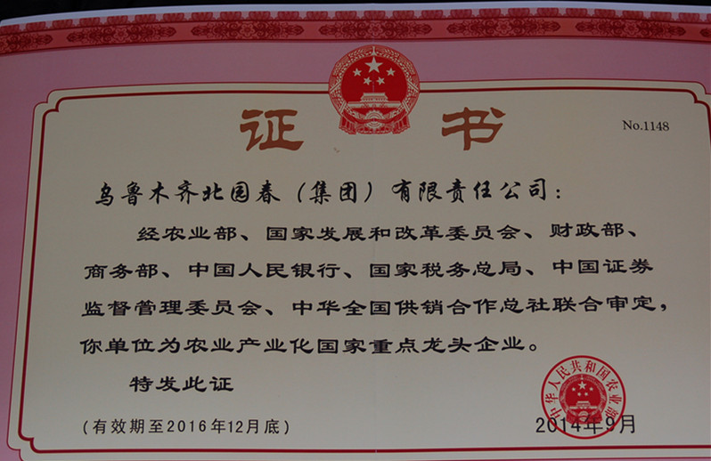 2014年9月,北園春(集團)公司經國家農業部第七次監測審定為“農業產業化國家重點龍頭企業”(有效期至2016年12月31日)。